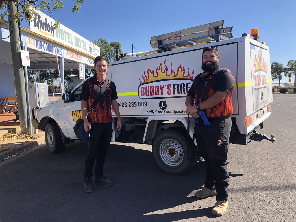 I suppose that for a fire safety certificate, every hotel, shop, hall, school or office building across the state must have its fire extinguishers checked and signed off on regularly. That’s what these two were here for. Based in Rockhampton, six hours’ drive east of Barcaldine, they worked for a firm called Buddy’s Fire, spending their days driving round the Central West checking fire equipment.