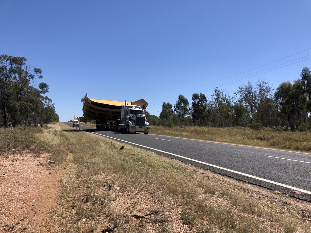 Last month, driving through mining country on the Gregory Developmental Road north of Clermont, Con and I met a “Wide Load” pilot vehicle. Soon after, a police car came towards us, on our side of the road, urging us off on to the gravel verge. With a crest on the road five hundred metres ahead, we still couldn’t see anything coming, so we eased our way along with two wheels on the bitumen, until another police car waved us further off the road. Pulling over, we stopped and waited.