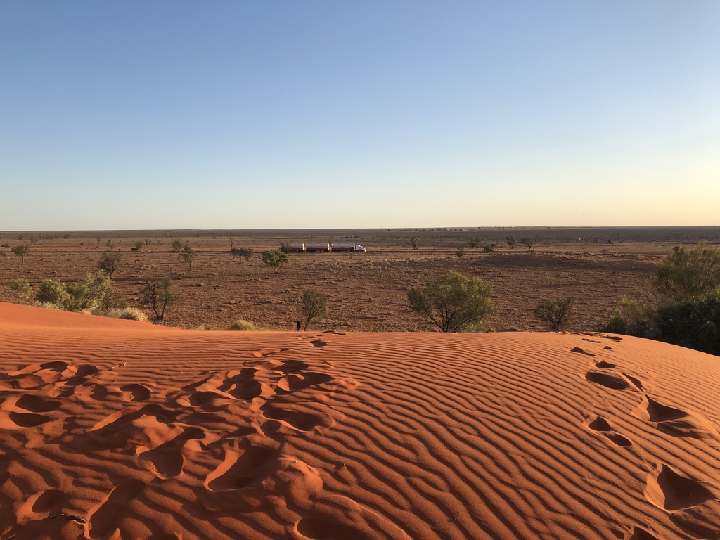 Main photo: a cattle road train passing a sand dune, heading west from Windorah towards the setting sun