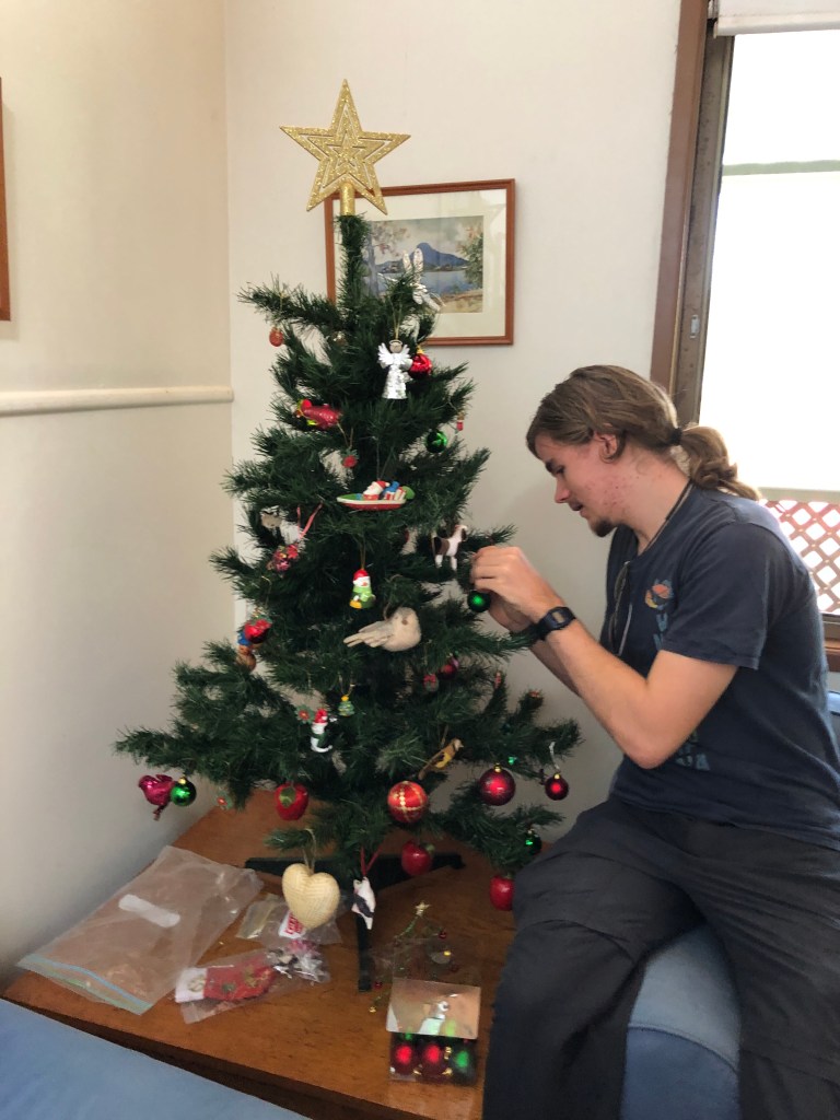 We always have some kind of Christmas tree. If we’re away from home I’ll find something green to hang a few baubles on and put presents under. An artificial plant in a holiday apartment at Maroochydore (holiday apartments always have some kind of artificial greenery, it seems), shrubs outside our cabin the year we spent Christmas in a caravan park at Dorrigo, N.S.W.