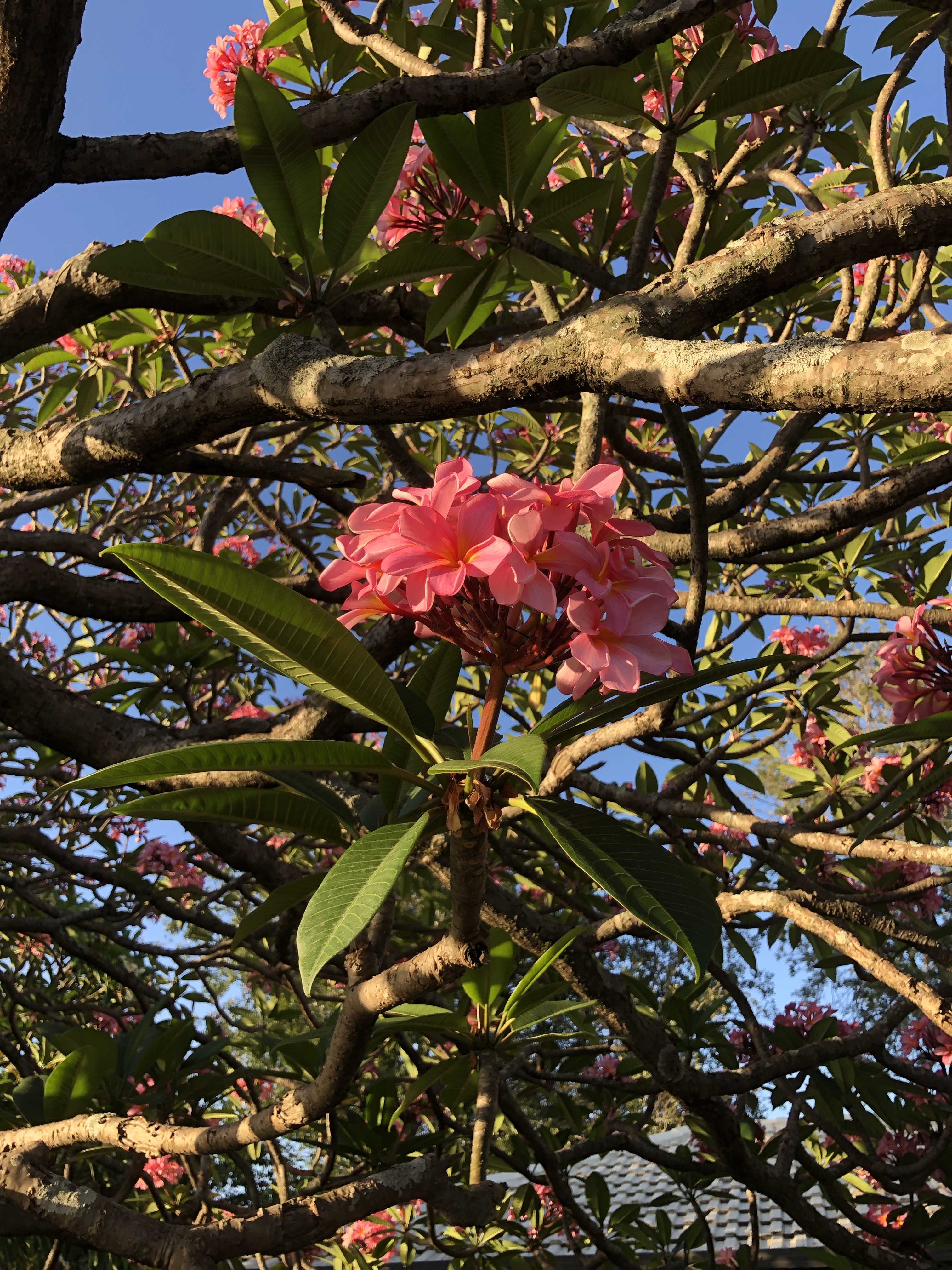 I’ve begun a new Pandemic project: to collect all the colours of frangipani. They grow easily from a broken-off piece, left to dry in a dark place. Carrying a plastic bag to stop the sticky sap dripping, and seeking low branches hanging over front fences, I now have acquired pieces of red, yellow, apricot and deep pink-flowering trees. I’ll plant them in a row in a new stretch of garden beside the house. They’ll be a reminder of a challenging time, when I found comfort in walking the suburbs of a beautiful city.